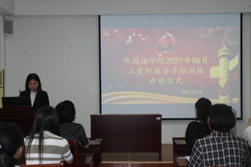 6月17号下午,外国语学院2021年06月入党积极分子培训班开班仪式在8号教学楼418教室顺利举行。学院党委书记李静、学院全体辅导员以及参加本次党校培训的72名入党积极分子参加此次开班仪式,学院团总支书记、学生工作办公室主任周丽妲担任主持。