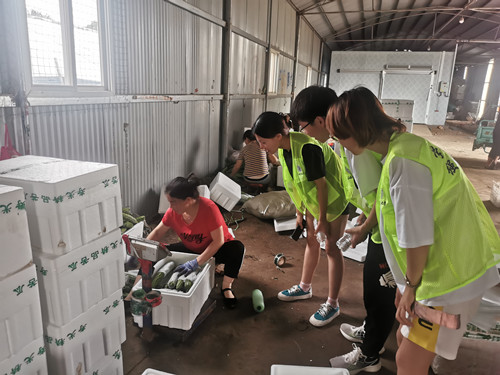 首先,实践团来到三元朱村的蔬菜基地进行参观学习。通过实践前期的讨论准备工作,实践团对三元朱村的产业模式和创新技术有初步了解。近年来,在党的领导下,寿光全方位推动理念创新、技术革新、模式更新。立足当地产业优势,优化产业结构。从“冬暖式蔬菜大棚”带动的绿色革命开始,再到如今的微机控制、电脑控制培养作物,以及引进、试验、推广了近20类300余个作物新品种,产业优势不断加强。并积极探索“文化+农业+旅游”发展模式,依托农业优势建设起村史博物馆、农知大道、第五代高科技温室示范园等景点。在参观过程中,成员们与当地菜农积极交流并体验如何利用新技术检验苦瓜等蔬菜的质量,最后还帮助农民把品质没有问题的苦瓜装箱。当被问到对现如今生活的感悟,菜农们纷纷感慨科技的发展和国家的进步所带来的当今生活的变化以及未来在政策指引与党的领导下,更加有信心建设繁荣乡村宜居乡村。