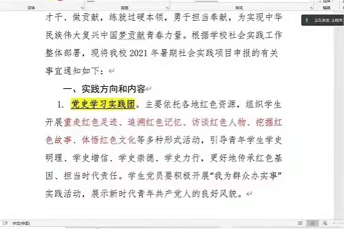 会议伊始,王晓萍带领队员学习《2021年暑期社会实践安全指南》着重强调实践中的安全问题。她指出,人身安全问题是重中之重,各成员要乘坐正规交通工具,保持通讯畅通,团队所有成员原则上应统一出发、统一购票、乘车,如有特殊情况,需事先向团队负责人报备,征得其同意后方可进行,同时团队建立严格的请假销假制度,任何成员不得擅自离队。实践过程中必须戴好口罩,尽量保持一米以上的安全距离,增强防护意识。