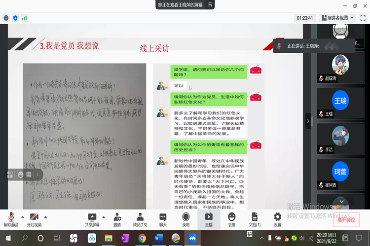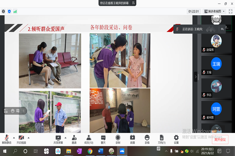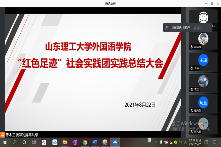 8月24日,“红色足迹”社会实践团在线上召开社会实践总结会议,为期16天的社会实践正式结束。此次会议由“红色足迹”社会实践团队长王晓萍主持,全体实践团成员参加。