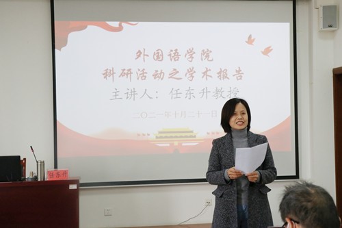 10月26日下午,我院特邀中国海洋大学外国语学院副院长、翻译学方向博士生导师任东升教授做了题为《“九评”翻译:特殊的“战时”国家翻译实践》的学术讲座。讲座在8号教学楼418会议室举行,由外国语学院副院长张燕主持,学校学术委员会成员王晓华教授出席,学院教师及研究生踊跃参加。