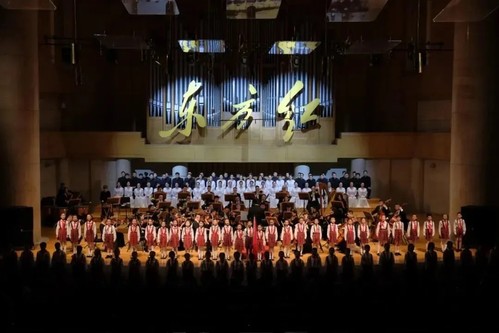 为庆祝中国共产党建党100周年,重温红色经典,深入开展党史学习教育,2021年4月22日晚,外国语学院党委组织80位党员及师生代表前往淄博保利大剧院观看大型音乐史诗《东方红》。