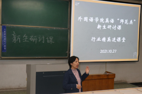 为使学生深入了解英语(师范类)专业的培养目标、做好学业规划,10月27日晚,外国语学院在4号教学楼204教室举行“行业精英进课堂”新生研讨会。此次研讨会由英语教育系主任彭静主持,张店区第八中学教师张玲主讲,英语(师范类)专业21级全体学生参加。