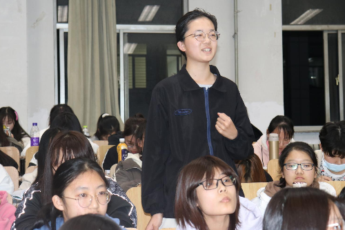 随后,张玲从专业知识、教师技能、班级管理和职业素养四个方面详细介绍如何成为一名合格的初中英语教师。在专业知识方面,张玲针对不同阶段的课程标准对学生知识储备提出要求,并给予相应学业规划指导;在教师技能方面,她向学生讲述成为教师所必须熟练掌握的信息技术和课件设计技能;在班级管理方面,她以初中学生需具备的品质为讲述出发点,进而引出作为班级管理者应掌握的技巧方法。此外,她通过介绍学院外出支教学生王慧卿的经历,从而生动诠释教师职业素养的核心内容。最后,她鼓励学生争做有理想信念、有道德情操、有扎实学识和有仁爱之心的合格英语教师。