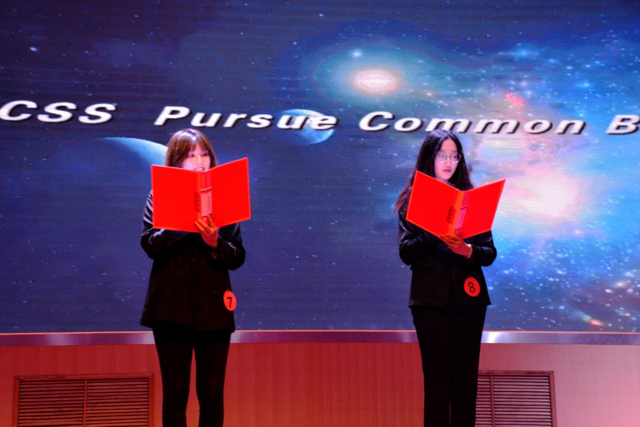 比赛进行前,主持人向在场人员简要介绍此次大赛的流程环节:第一环节为播放选手准备的自我介绍及配音视频;第二环节,即选手两两组队,进行分角色短文对话。