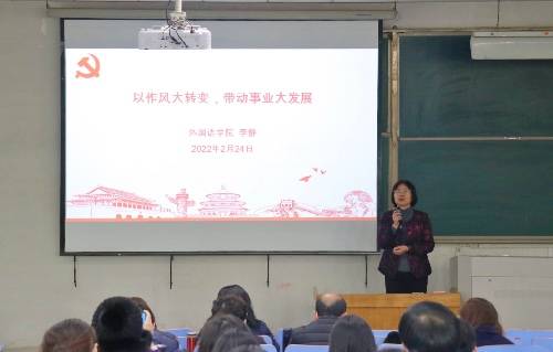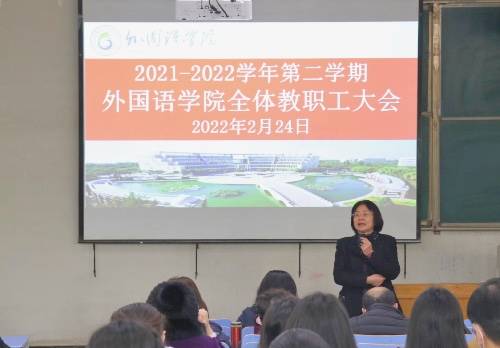 2月24日下午,外国语学院在5号教学楼103教室召开全体教职工大会,传达学校会议精神,总结2021年工作,部署2022年工作任务。大会由学院党委书记李静主持。