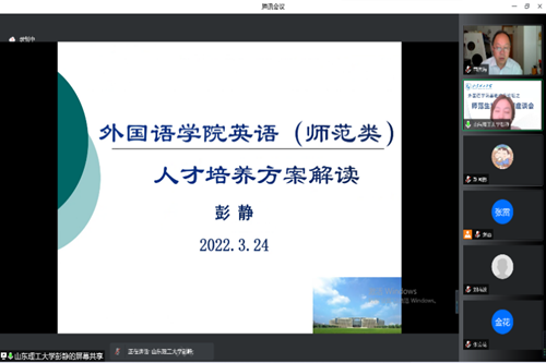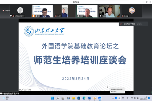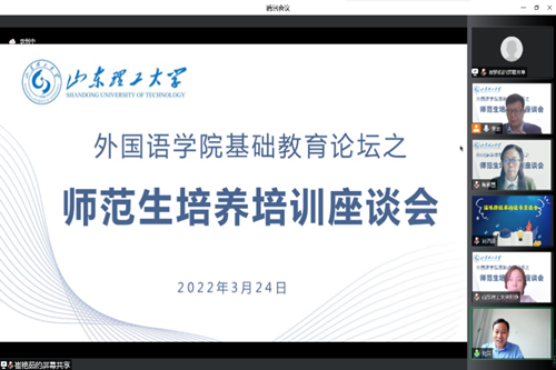 为了进一步提高英语(师范类)专业人才培养质量,充分发挥管理人员、用人单位、实践基地指导教师等利益相关方在师范生人才培养各个环节的参与与评价作用,3月24日下午2:30,学院通过腾讯会议线上举办师范生培养培训座谈会。作为学院基础教育论坛的重要组成部分,此次座谈会以“贯彻认证理念,共促师范生培养质量”为主题,由外国语学院院长助理张雷主持,特邀淄博市教育局人才服务中心主任、淄博市教委初高中教研员、中学校长、指导教师与优秀校友代表参加,教师教育学院副院长郑兆青一同参加座谈。