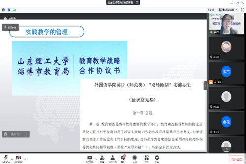 然后,英语教育系副主任陶新慧从实践教学的理念、目标、内容和管理四个方面对英语(师范类)专业实践教学体系进行了解读,展现了英语(师范类)专业“求真务实”的实践育人体系,以及“四年不断线、学教研一体化”的实践教学体系。另外,陶新慧老师还简要介绍了《外国语学院英语(师范类)专业“双导师制”实施办法(征求意见稿)》,并征求了参会代表对该实施办法的意见。