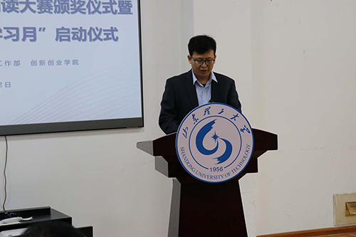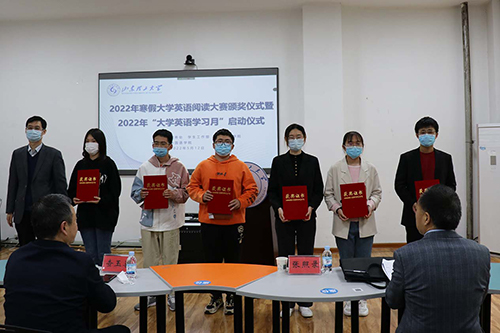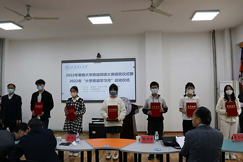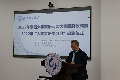 为营造浓厚的大学英语学习氛围,切实提升学生英语核心素养和综合能力,助力“五有人才”培养目标实现。5月12日下午,由教务处、学生工作部和创新创业学院主办,外国语学院承办的2022年寒假大学英语阅读大赛颁奖仪式暨2022年“大学英语学习月”启动仪式在8号教学楼218教室举行。校党委常委、副校长查玉喜,学生工作部部长赵明,校团委书记、创新创业学院院长王振,外国语学院院长牛书田及学院教师代表和获奖学生代表参加。 此次活动由教务处处长张照录主持。