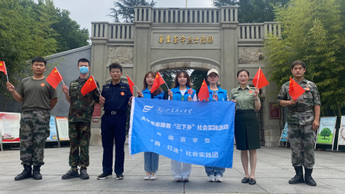 图为实践团成员与军人在烈士陵园前合照。华东革命烈士陵园是为纪念自第一次大革命时期至解放战争时期,华东地区牺牲的革命先烈而修建的大型纪念性建筑群和纪念园林。(撰稿:王馨馨 李小雨 摄影:李小雨)