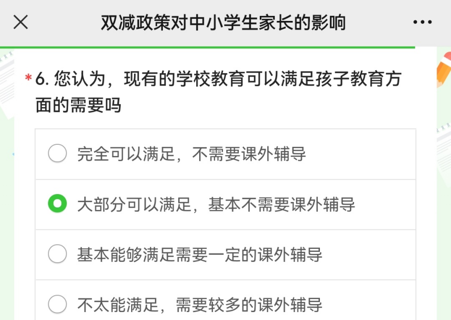 与此同时,“蒲公英”社会实践团成员们继续转发分享《双减政策对中小学生家长的影响》的调查问卷,进而了解家长们对于这一政策的看法与反馈,以及便于社会各界为“双减”政策的落实进言献策。作为“双减”政策的间接影响者,家长们的看法对于“双减”政策的落实有很大的影响,实践团成员通过问卷形式了解双减政策施行后孩子们的学习方面的变化、家长对学校教育的满足度以及家庭教师的看法等等。
