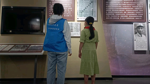 图为实践团成员为青少年对红色事迹进行讲解。