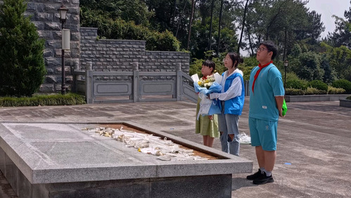 图为实践团成员与青少年在烈士浮雕前献花。