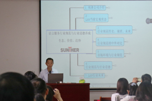 张勇以“翻译行业标准与职业道德”为题,以行业领军者的视角,从双泽公司介绍、LSP当前宏观状态、行业规范历史现状未来、行业规范的中外对比、市场环境与行业规范、行业规范与行业道德、LSP行业未来七个方面向师生们分享了许多深刻见解与宝贵建议,条理清晰,见解独到。在座师生们在张老师生动的讲解中受益良多,对翻译市场的现状与未来有了更加清晰的认知,得到了许多自身发展的启迪。