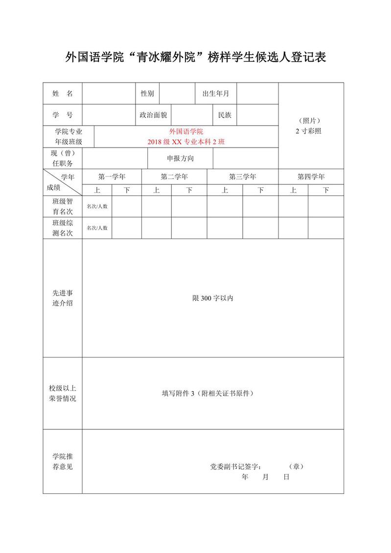外国语学院“青冰耀外院”榜样学生候选人登记表