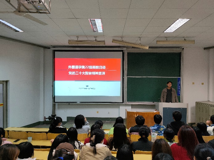 为做好党的二十大精神宣讲工作,学院团委按照学校和学院总体部署和规划,制定了《外国语学院团委学习宣传贯彻党的二十大精神工作计划》,认真准备宣讲内容,精心组织策划实施,多渠道、多形式、多载体推进党的二十大精神的专题宣讲与宣传。为开展好党二十大精神宣讲主题班会,当好党的二十大精神“宣讲员”,各辅导员立足自身工作实际,结合宣讲内容,自命“主题”,主动“上讲台”领学宣讲,宣讲既包括二十大精神重大意义、基本情况等必讲内容,也包括结合自身工作实际需要重点宣讲的自选内容,起到良好的学习效果,进一步浓厚了学院学习氛围。