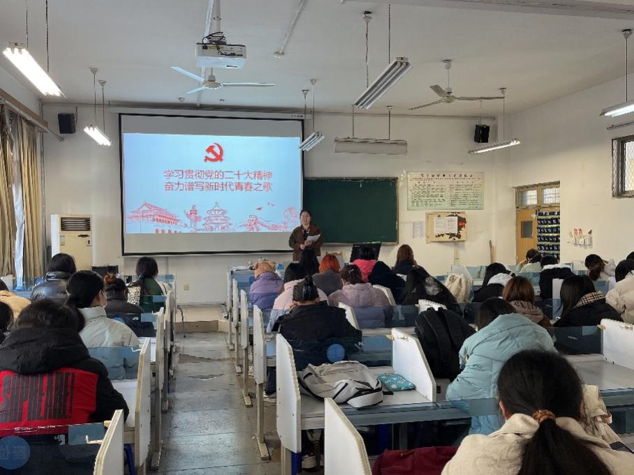 辅导员崔鹏以“从党的二十精神中汲取青春奋进力量”为主题,向同学们讲述了党的二十大召开的重要意义,介绍了党的二十大报告的基本内容,并结合党史和优秀共产党员典型事迹,勉励同学们要珍惜青春年华,珍惜大学时光,科学规划大学生活,始终把学习作为首要任务,志存高远,多做经得起时间考验的事儿,积极保持良好的心态,树立良好的格局,构建良好的国际视野,在将来学习、工作和生活中,不仅要实现自身价值,还要实现更多社会价值,让奋斗成为青春最亮丽的底色。