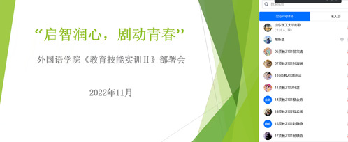 为帮助英语(师范类)专业学生逐步掌握中学英语教学基本技能,培养英语教育从业能力,提高学生参加教育技能实训的积极性,外国语学院在11月29日晚线上召开2021级英语(师范类)学生教育技能实训Ⅱ动员大会。此次会议由英语教育系主任彭静主持,优秀教师陶新慧、李丽主讲,2021级英语(师范类)专业各班班主任及全体学生参加。