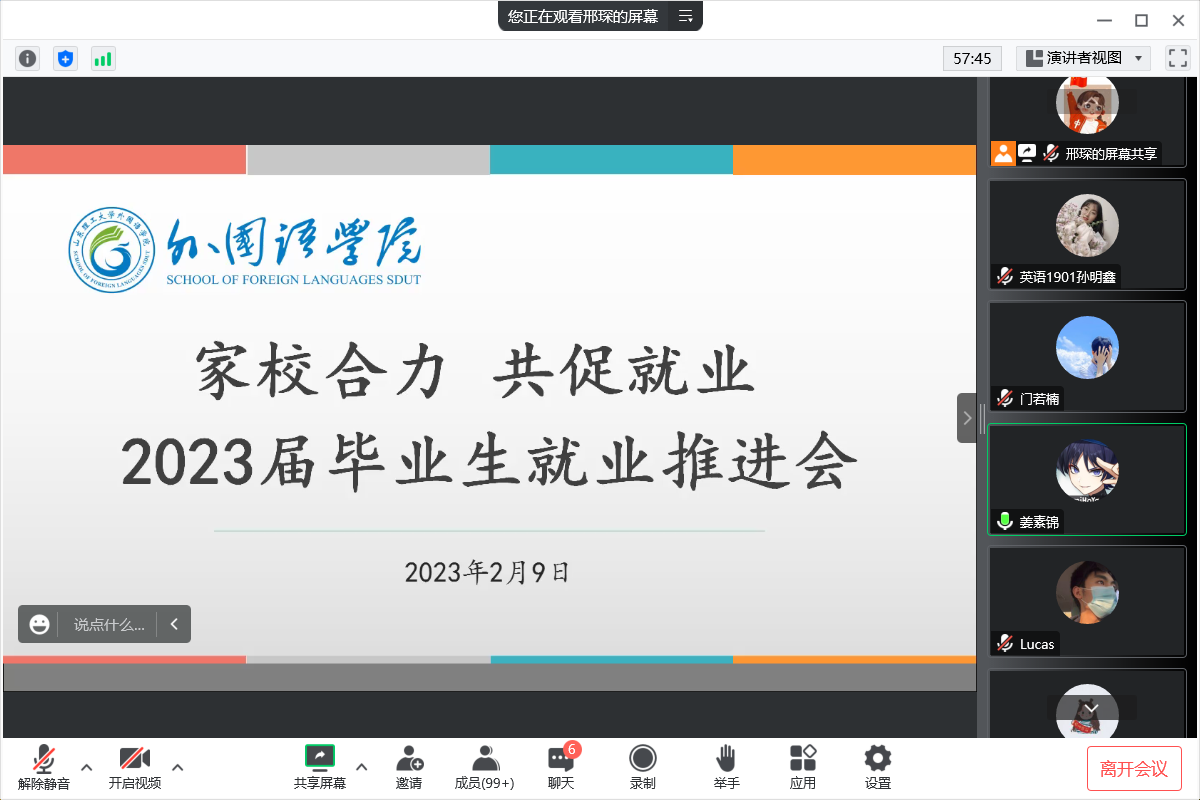 为进一步做好2023届毕业生的就业指导服务工作,发挥家校合力,更好地促进学生更充分更高质量就业,2月9日,外国语学院召开“家校合力 共促就业”2023届本科毕业生就业推进会。学院党委副书记姜素锦,系主任、本科毕业班班主任、本科毕业班辅导员和2023届全体学生及家长共同参加会议。