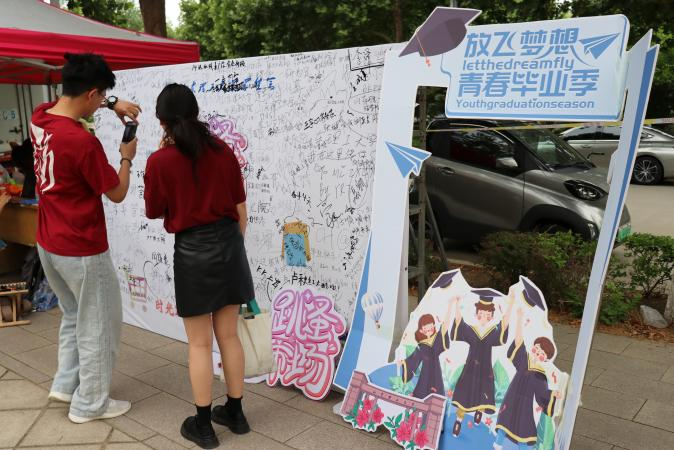 为了吸引到更多消费者,不少摊位打出“全场一元”、“买一赠一”等口号,现场的精彩表演也同样吸引了一大批游客前来驻足挑选。不仅如此,现场设置的签名墙,也让毕业生和学弟学妹之间有机会互送美好祝福,表达美好祝愿。