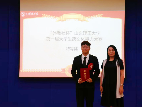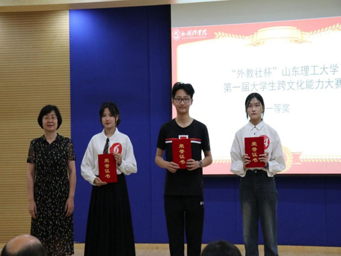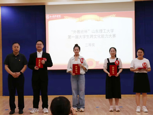 最终,经评委老师打分,冯少帅获特等奖;詹若杨、黄靖懿、梁嘉和获一等奖;孙玉坤、杨舟梓靖、郑泽群、吴洪杰获二等奖;陈雨庭、李佳音、熊晨、甄若凡、牛富清、梁美辰、李潇瑶获三等奖。山东理工大学教务处处长庞秋香、外国语学院党委书记李静、院长牛书田、副院长张雷为获奖选手颁奖并合影留念。