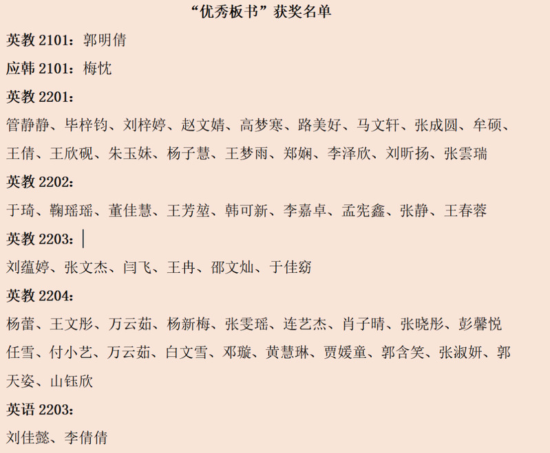 此次板书比赛为我院师范生搭建了相互学习、相互交流、展示自我的平台,提高了师范生书写技能水平,有助于强化学生师范技能训练的主动性和积极性,有利于营造学院乐读好学、勤练擅写的氛围,期望同学们在今后的学习中不断提升专业技能,完善内在修养,为将来的职业发展奠定良好的基础。(撰稿 刘瑛 摄影 周霄)