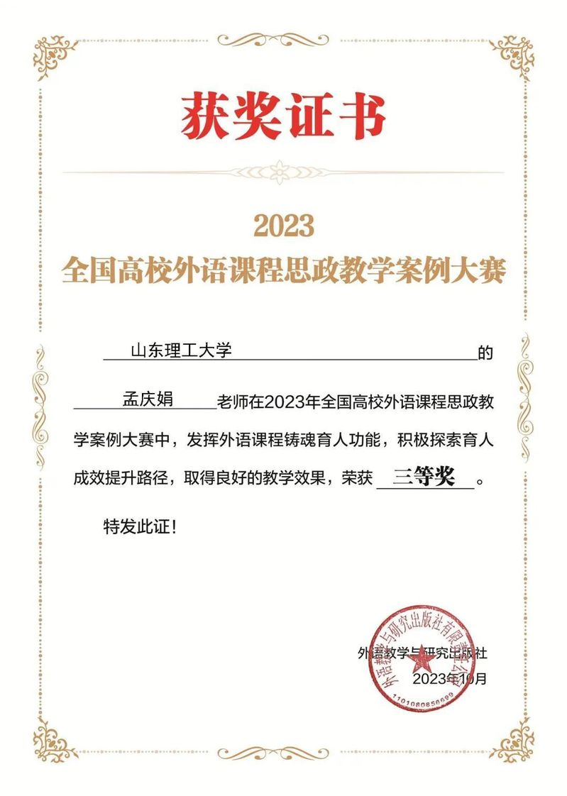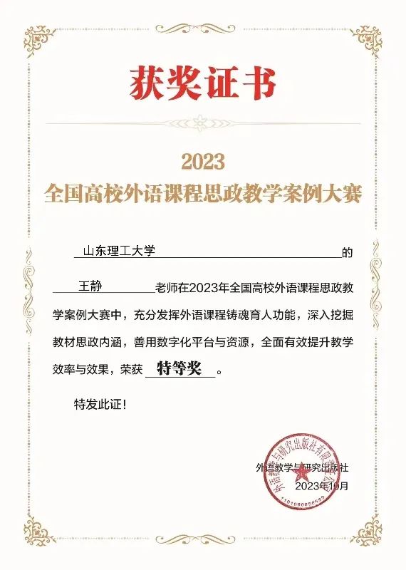 为全面推进高校外语课程思政高质量建设,落实立德树人根本任务,外语教学与研究出版社于2023年5月启动全国高校外语课程思政教学案例大赛。在本次大赛中,我院王静老师荣获特等奖,刘明霞老师和孟庆娟老师荣获三等奖!