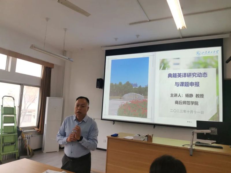 为拓宽典籍英译课题申报思路,10月11日下午我院特邀商丘师范学院外语学院副院长杨静教授做专题报告。外国语学院党委书记李静、院长牛书田、2024年度国家社科基金项目申报人员及科研骨干教师参加本次报告,报告会由副院长张燕主持。