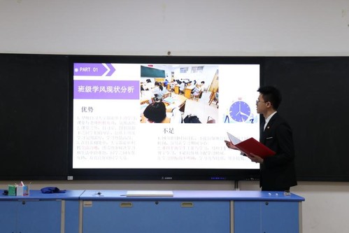 在答辩展示环节,各班级答辩代表以PPT的形式分别从班级建设制度和规划、当前学风建设现状、问题解决与奖惩措施、班委“包干”责任制、预期成效以及班级建设风采等方面进行讲解。各个班级代表们依次讲演,均表现不俗,有力地展现了班级的整体精神风貌和端正积极的学习态度,在点明班级问题的同时,也提出了切实可行的改进方法。