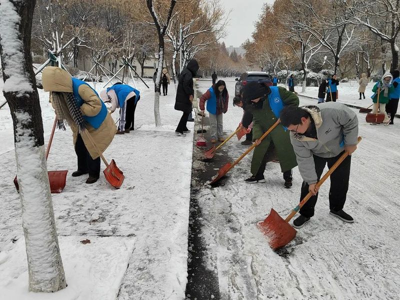 师生们齐聚8号教学楼,统一领取清雪工具,扫雪、破冰、除冰,有条不紊地进行清雪工作。面对大面积积雪,志愿者在老师的带领下分工明确,负责清扫人行道、台阶、花坛周围等区域的积雪。志愿者手持铁锹、扫帚等清理工具,两人一伙、三人一群,挥锹舞帚、凿扫铲推。志愿者齐心协力,配合默契,干得热火朝天。外院蓝色志愿服的身影在雪地里构成一条靓丽的风景线。
