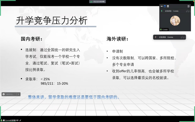 刘国妮结合自己丰富的留学工作经验,通过国内VS海外读研、留学项目选择和申请准备三个方面,解读了出国留学最新政策、国家选择、申请材料准备、语言考试方式以及留学期间生活规划等,为学生提供了宝贵的建议。
