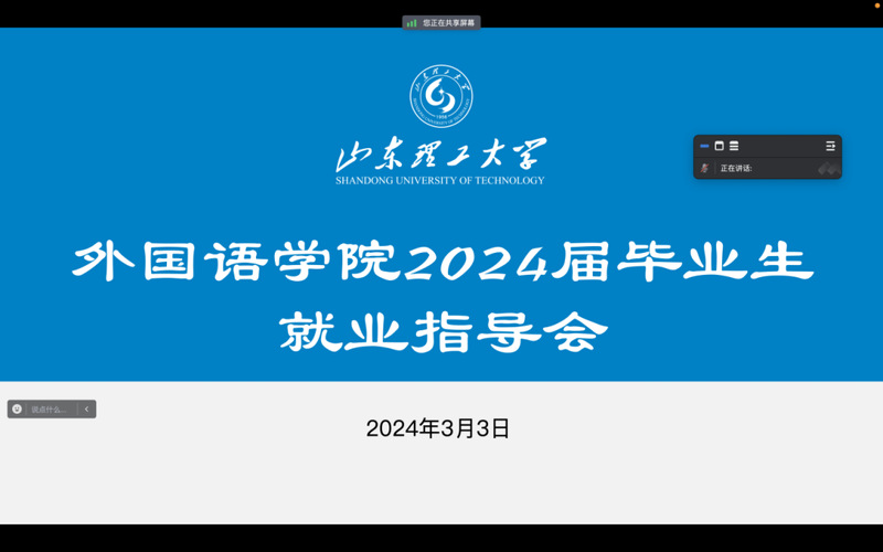 为进一步推动毕业生就业工作,引导学生明确升学、就业方向,助力2024届毕业生顺利、高质量升学、就业,3月3日下午,结合当前大部分毕业生在校外实习等情况,外国语学院2024届毕业生就业指导会在线上举行。外国语学院党委副书记宋伟、2024届全体毕业生参加会议,修文德鲁教育集团本硕申请导师刘国妮,圣儒联合创始人张文豪,鲁泰纺织服装学院学生工作办公室主任、团委书记王晓冬受邀参加并针对出国留学、考公考编指导、求职就业等方面进行分享。会议由辅导员王惠主持。