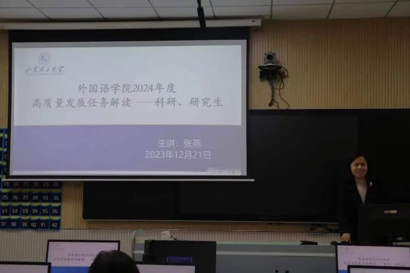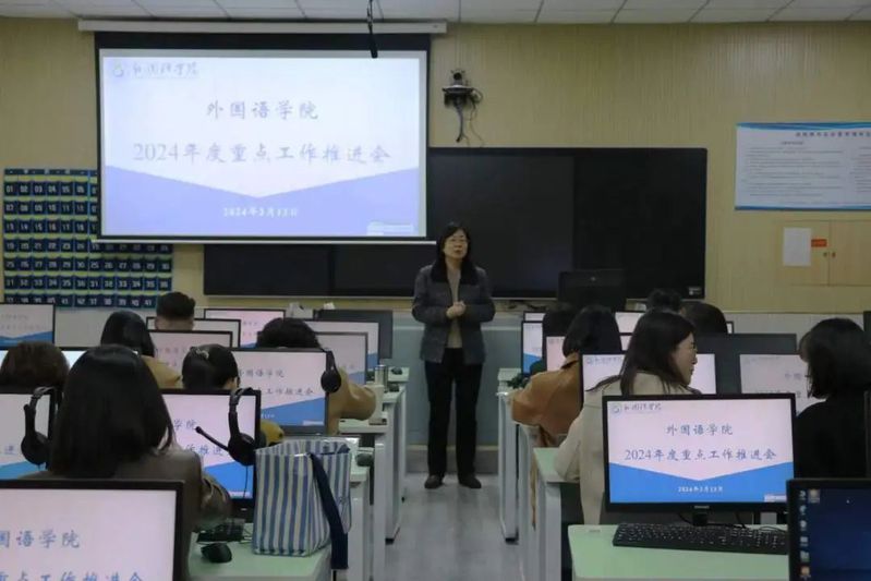 为进一步贯彻校党委四届四次全委(扩大)会议精神,落实学院“十四五”发展规划和推进2024年各项重点工作,3月13日下午,外国语学院在8号教学楼216教室召开2024年度重点工作推进会。学院领导班子成员、教授委员会成员、科级干部、系部主任、党支部书记、民主党派人士、高层次人才参加会议。会议由学院党委书记李静主持。党委书记李静汇报了本次重点工作推进会的目的及意义,并结合学校党委相关部署对学院本年度各项工作提出了要求。她指出,与会教师作为学院的“关键少数”,要以此次推进会为契机,认真对标学院高质量发展关键指标,齐心协力,为学院高质量发展作出新贡献。