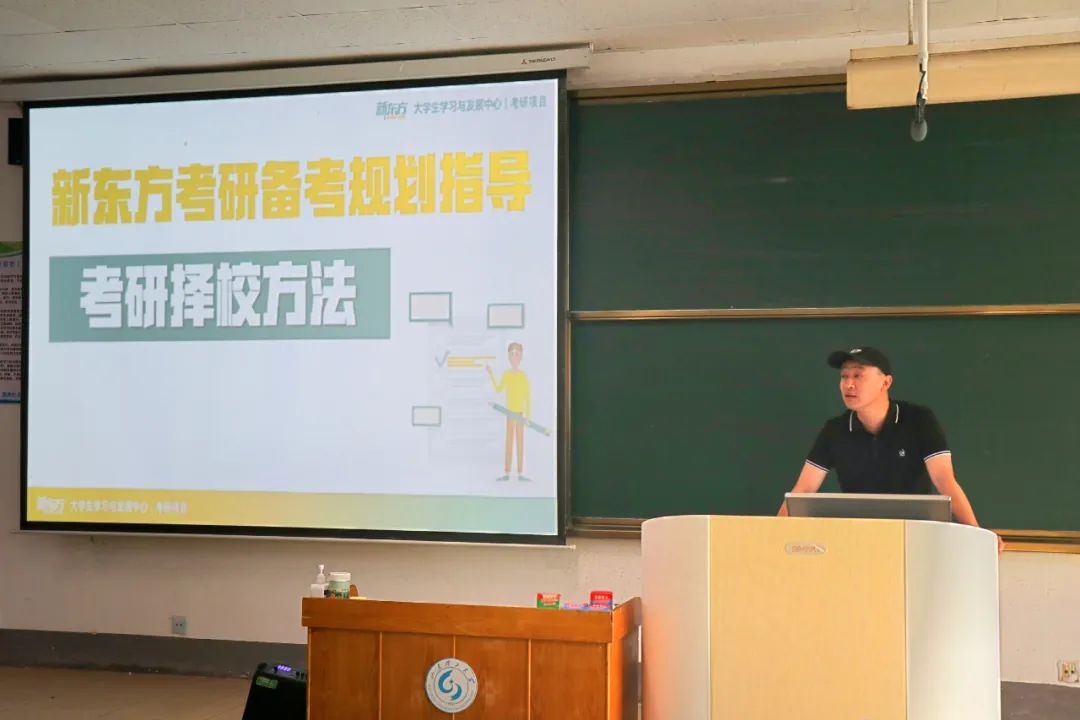 随后,新东方在线淄博服务中心负责人、山东齐教教育升学规划师韩特进行考研交流分享。韩特从报考专业、专业课考察内容、对应院校推荐、择校备考四个方面给大家做了科学合理的分析与经验分享。他勉励同学们要切实分析自身条件,做好充分准备工作,合理规划时间,认真刻苦备考。