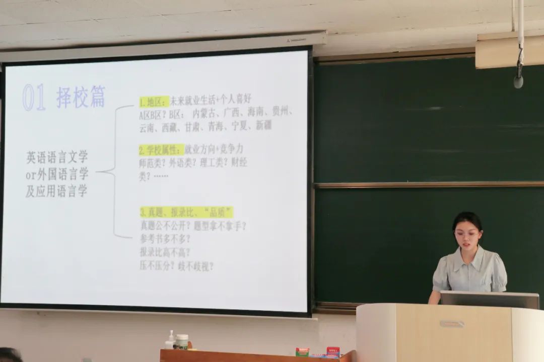 英教2001班学生臧真代表全体考研学生为2021级同学做经验分享。她表示要明确自己的考研方向,确定目标院校。此外,她还从复习计划制定与考研资料推荐两方面提出了备考建议。