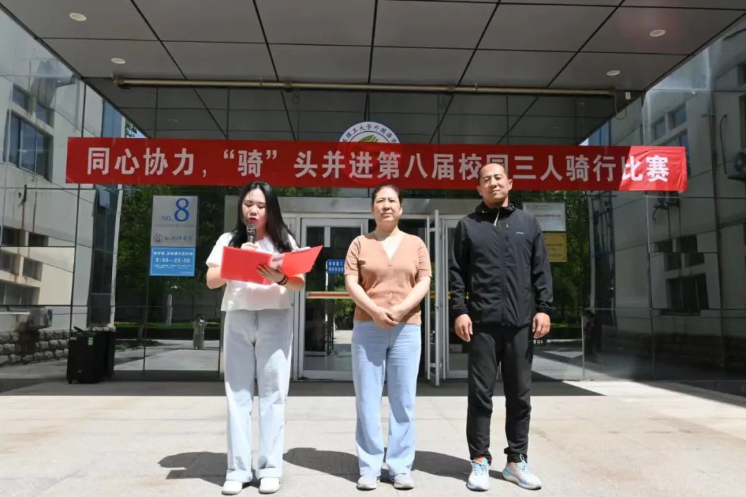 启动仪式第三项,崔鹏宣布同心协力,“骑”头并进——第八届校园三人骑行比赛正式开始。