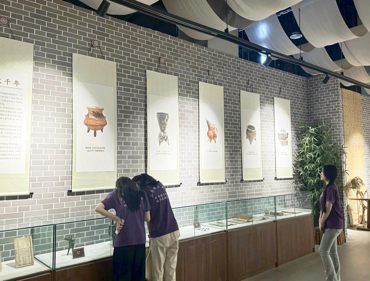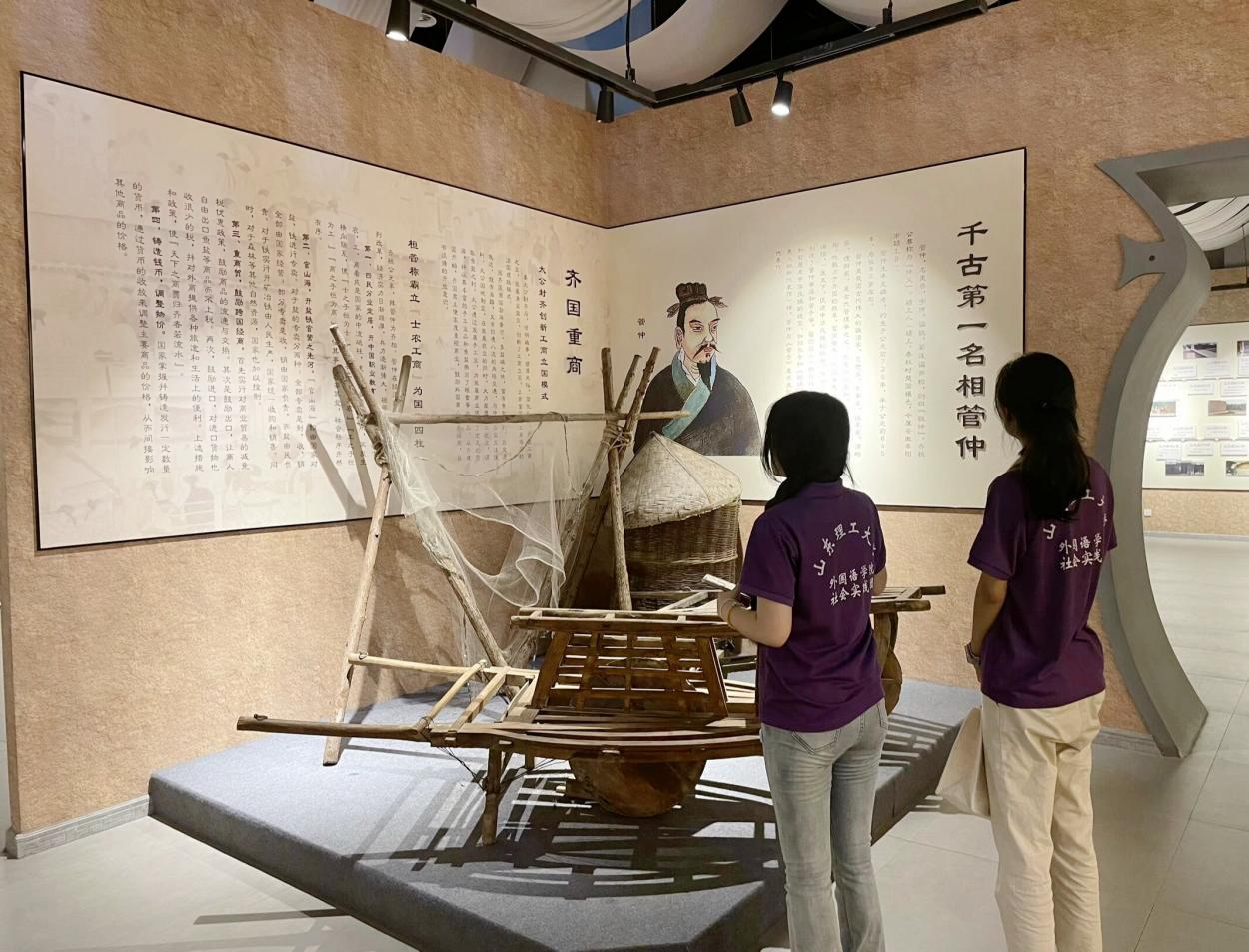 活动伊始,实践团成员在工作人员的带领下来到了“齐风记忆体验馆”。在这里,齐国的历史脉络与深厚的文化底蕴迎面而来,齐风记忆体验馆通过提取优秀文化记忆,复原古代文化元素,利用文字、图像等传统手段和声光电等现代技术,还原齐文化场景,展现古人生活生产状况。从姜太公封地建国到春秋五霸、战国七雄的波澜壮阔的齐国历史,再到陈列的一件件精美的青铜器、陶器、古钱币、古代器皿、古代织物等背后的发展故事,实践团成员通过参观齐国时期的各种农耕工具、乐器、丝绸、陶器,阅读历史文化展示牌,走进厚重而又多彩的“历史”,体验先祖的生活,感受古人的智慧,提高了对齐文化的理解水平,增强了对文化传承的自觉性和积极性,了解齐国的历史沿革和文化特色的同时,也深刻体会到了齐文化中所蕴含的文化魅力与文化内涵对现代社会文化发展的重要作用。