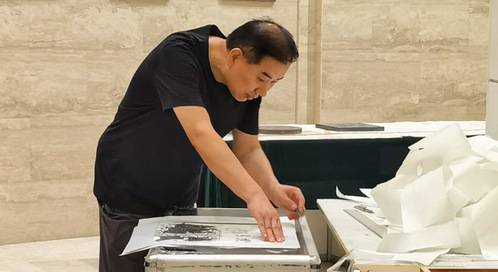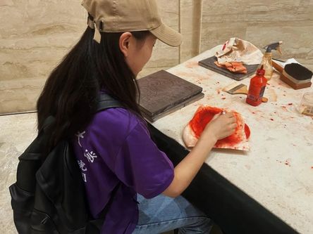 除此之外,实践团成员来到了石刻拓印研学体验中心,了解石刻的历史故事和传统拓印技艺。石刻非遗文化传承人为实践团成员介绍了石刻制作所需的工具和材料,并在制作过程中细致讲解了如何使用这些工具。成员们认真学习每个步骤,并在传承人的教授下体验拓片制作,体会到石刻艺术的独特魅力。