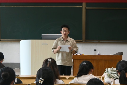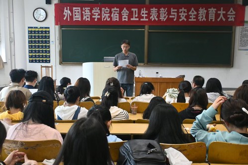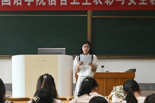 学生代表、主席团成员连康带领全体学生学习了《外国语学院宿舍舍长工作规范》。他领学了7点工作规范要求,进一步明确了舍长具体职责和工作要求,为后续工作提供了详细指导。