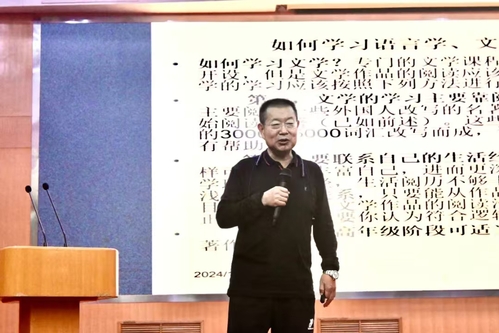 刘振前教授以“学会学习——怎样才能学好外语”为题,结合个人学习和教学经验,用生动的事例、风趣的讲解深刻分析了当前英语专业的发展趋势和就业前景。同时,他还深入探讨了文学、语言学、翻译与语言学习之间的关系,为同学们提供了针对性的学习方法,并从“如何培养听力与口语表达能力”和“如何提高阅读与写作能力”两个方面,给同学们提出了具体建议。