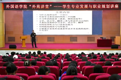为进一步帮助学生明确专业发展目标,引导学生做好大学职业规划,10月17日下午,我院在三号报告厅举行学生专业发展与职业规划讲座。本次讲座由山东理工大学讲座教授刘振前主讲,我院教师代表、2023级、2024级英语、英教专业全体学生参加,讲座由外国语学院副院长张雷主持。