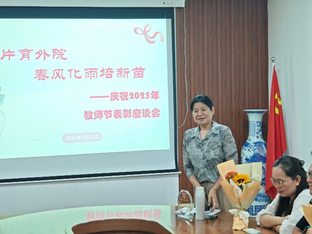 受表彰教师结合自身在教育教学、科研创新及管理服务等方面的实践经验和深切感受,分享了从教多年的心得体会,并表示要切实落实立德树人的根本任务,坚守教育初心,以更加饱满的热情投入到今后教育教学工作中。副院长于志涛代表班子成员与现场教师进行了深入交流,他向全体受表彰的教职工表示祝贺,并希望全体教职工恪守师德、钻研业务、潜心育人,共同打造有温度的外院大家庭。