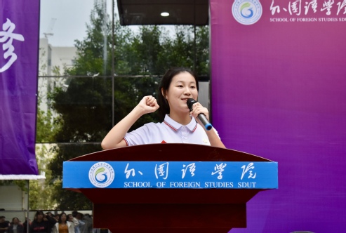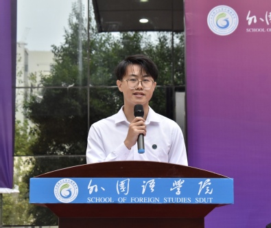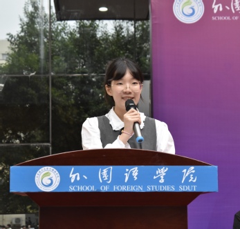 仪式第三项,2025级新生代表朱亿卿发言。她表达了对大学生活的憧憬与决心,并结合“内外兼修,中西贯通”的院训,阐述了成长为复合型外语人才的自我路径,并代表全体25级新生表示:将以勤学为本,固基强能;实践为要,知行合一;情怀为魂,贯通中外,不负时代、不负韶华,共同书写绚丽的青春篇章。