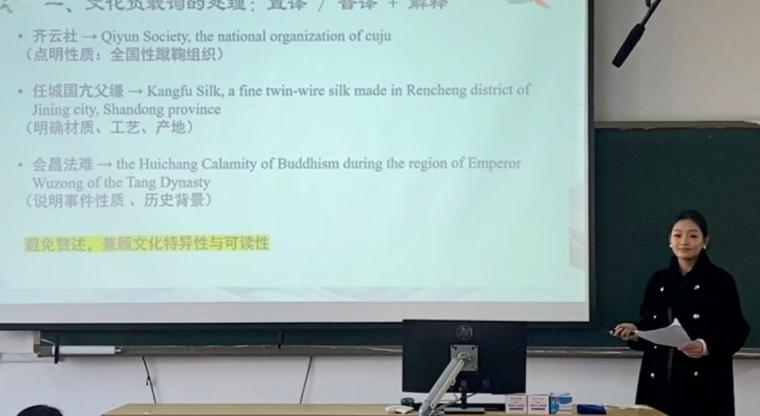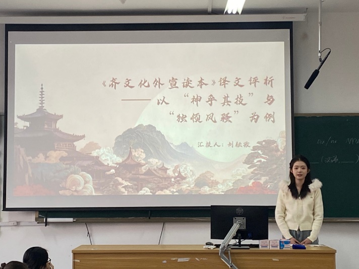 第二个模块是研究生品评荐书。翻译硕士刘佩瑶、倪青、吴欣桦、咸志成、宋开宇、孟祥帆、刘耘孜、范雅绮等8位同学依次登台分享阅读心得,她们选取书中不同章节,以案例分析切入,从文化负载词、民俗意象、故事性表达及文化外宣等维度出发,结合翻译理论与实践知识对译文进行赏析与探讨,学习译文亮点,并对译文提出相关优化建议。