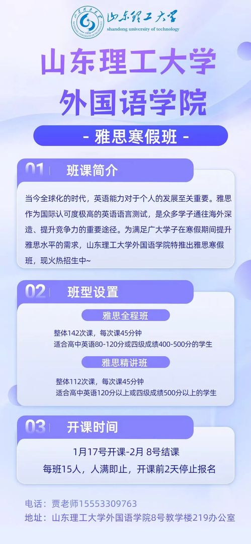 04高性价比与留校协助:学院在保障优质教学质量的基础上,制定高性价比的收费标准,让学生以更低的价格享受更优质的雅思培训。针对假期备考需求,学院为报名的山东理工大学在校生提供寒假留校协助,为假期集中备考筑牢保障,让大家能够全身心投入学习,高效攻克雅思重难点,稳步提升备考成效。